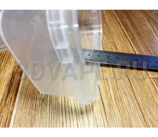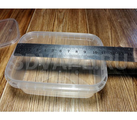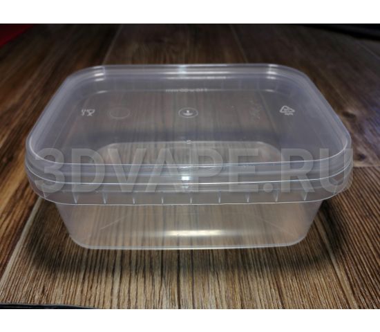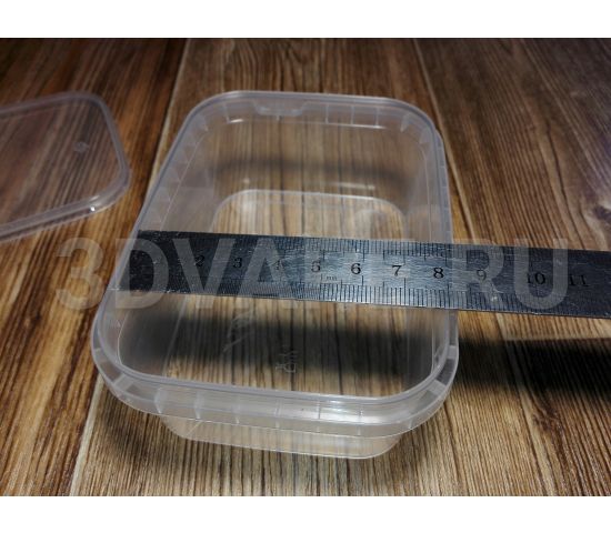 Контейнер прямоугольный из плотного прозрачного пищевого пластика. Ширина 110 м, глубина 80 мм, высота 40 мм. Объем - 280 ml Герметичная крышка с пломбой первого вскрытия. Производство Белоруссия / Россия.